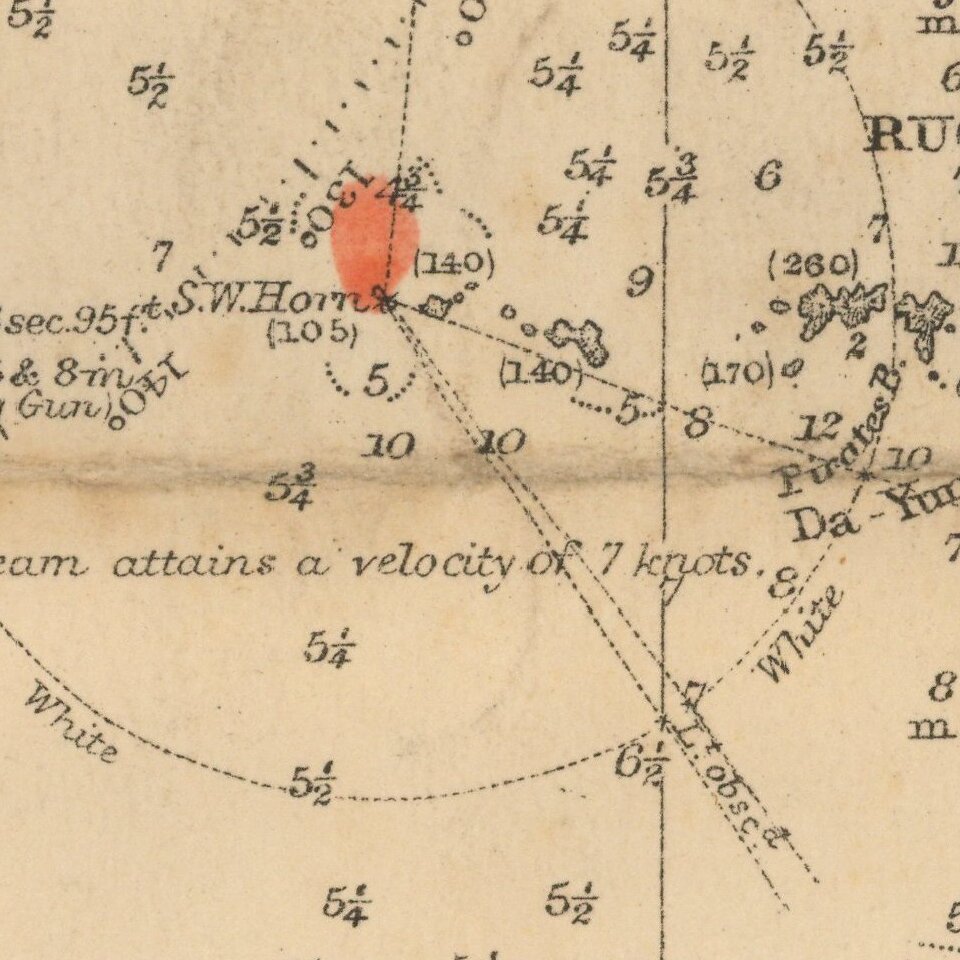 Detailed sea chart of the mouth of the Yangtze River in the north to the Zhousan Island, published by the British Admiralty.