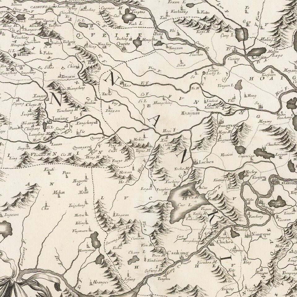 The map provides an early look at the areas around Shanghai, Hangzhou, Jinan, Zhengzhou, Xiangyang, etc. Jesuit missions are shown (IHS), three of which are close to Shanghai. The map would have been drawn based on the knowledge of the Jesuits and indigenous Chinese maps.
