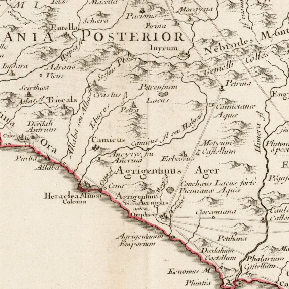 Detailed map of ancient Sicily, showing roads, mountains, rivers, towns, harbors, smaller islands, etc. Extends south to Malta.
