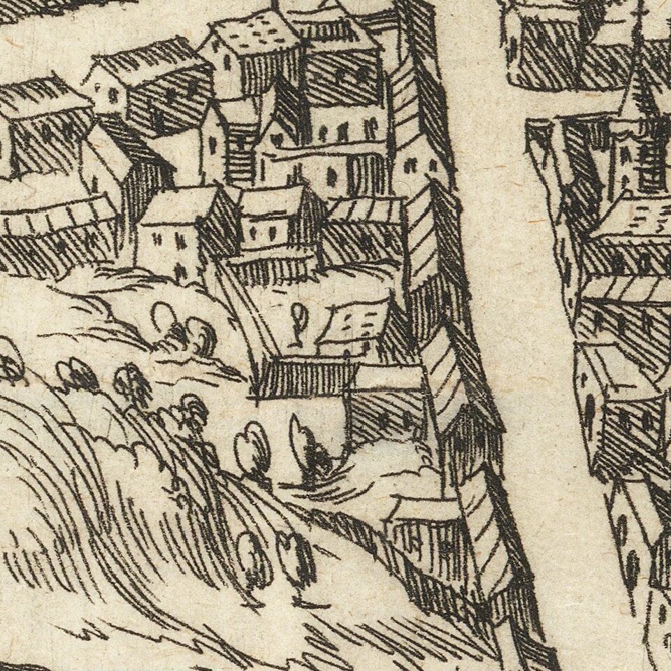 Detailed birds-eye view of the city of Poitiers, engraved to celebrate the resistance to the siege by the Huguenots led by Admiral Coligny. The long title tells how the city managed to resist thanks to "vigilance, prudence, value and virtue and ardor” of the Catholic commanders, of the governor Luda and of the inhabitants themselves.