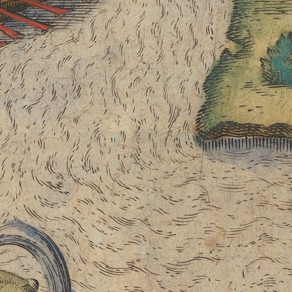 In 1590, de Bry began to publish his Les Grands Voyages, which would eventually stretch to thirty volumes released by de Bry and his two sons. The volumes contained not only important engraved images of the New World, the first many had seen of the geographic novelties, but also several important maps. He also published a collection focus on India Orientalis. Les Grands Voyages was published in German, Latin, French, and English, extending de Bry’s fame and his view of the New World.
