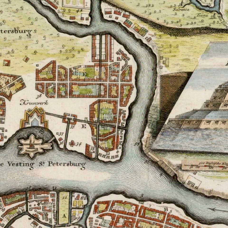 The first printed map to depict a version of the Le Blonde-Trezzini plan was Nicolas De Fer's Plan de la Nouvelle Ville de Petersbourg (Paris, 1717). With some modifications, this was followed by Johann Baptist Homann's map of St. Petersburg, published circa 1720.