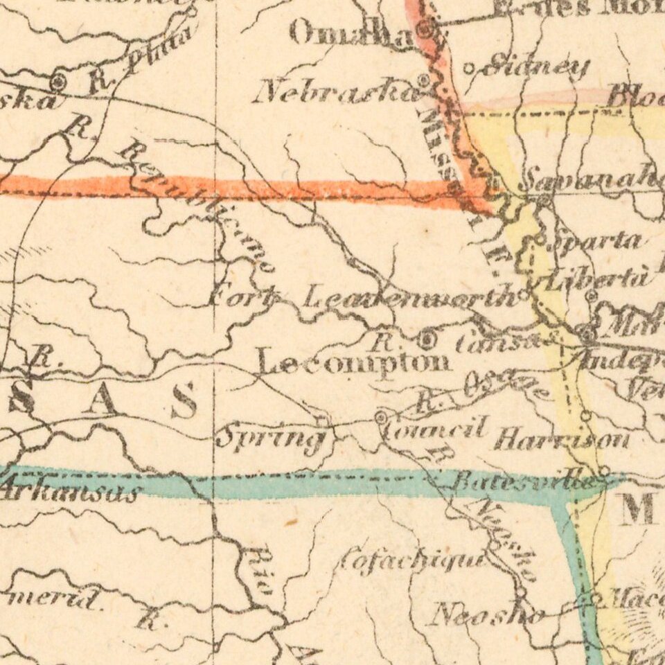 Other features of note include Minnesota covering most of present day North and South Dakota. Nebraska and Kansas Territories fill the entire plains region with Nebraska extending all the way to the Canadian boundary. Washington and Oregon both extend eastward to the Rocky Mountains. Utah and New Mexico are both shown in their largest configurations. No sign yet of Arizona, Nevada, Colorado, Idaho, Wyoming, Montana or the Dakotas.