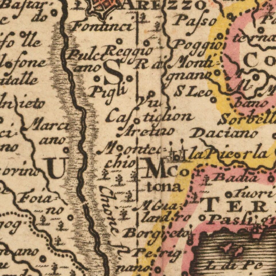 Striking map of Central Italy, from Milan, Mantua and Rvigo in the North to Rome, Aquila and Civita in the South and including a portion of Sardinia and various islands in the region.