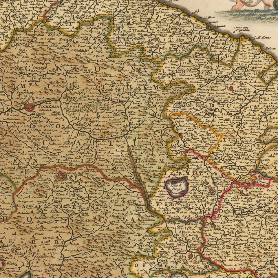 Old Color, gold heighted example of De Wit's detailed map of the State of the Church and Tuscany, with a portion of Corsica to the west.