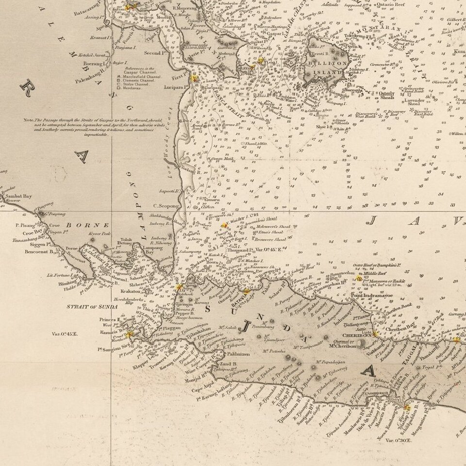 Detailed sea chart of the Straits of Malacca, Sumatra, Java and Western Borneo, Banca Island, Billiton Island, etc.