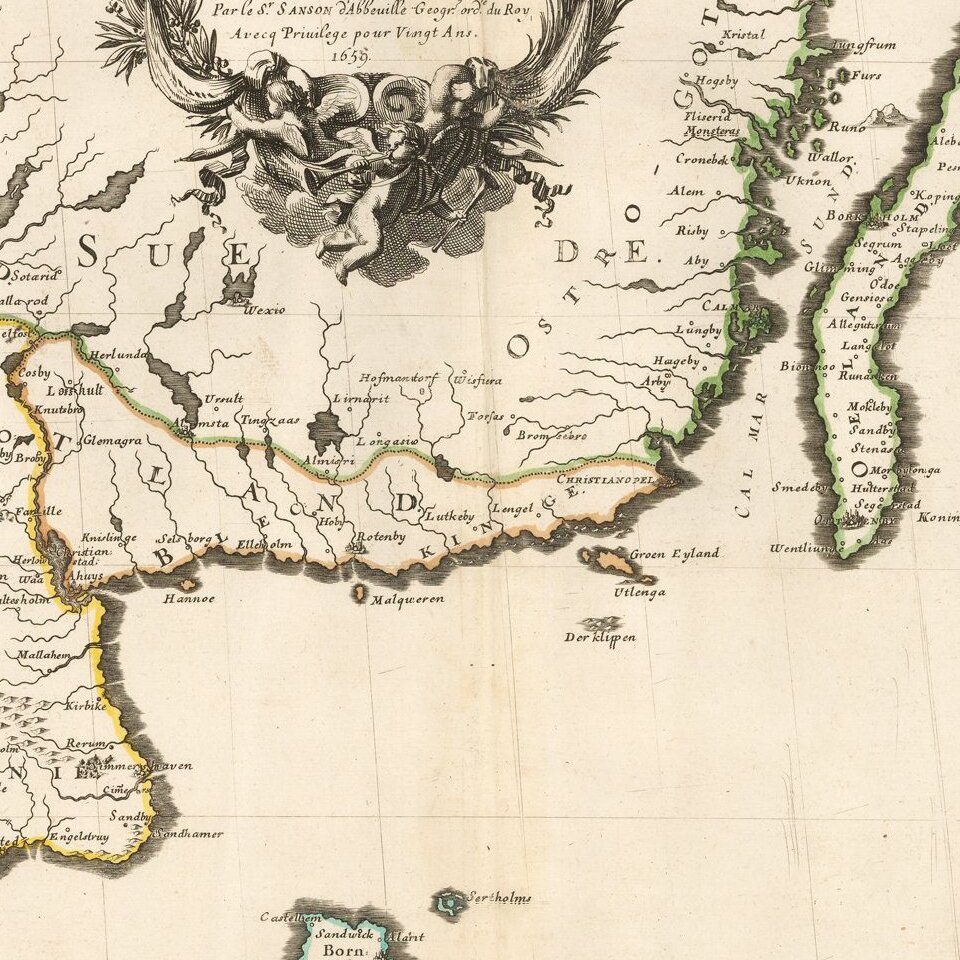 Very nice example of Sanson's 1659 double-page engraved map of southern Sweden.