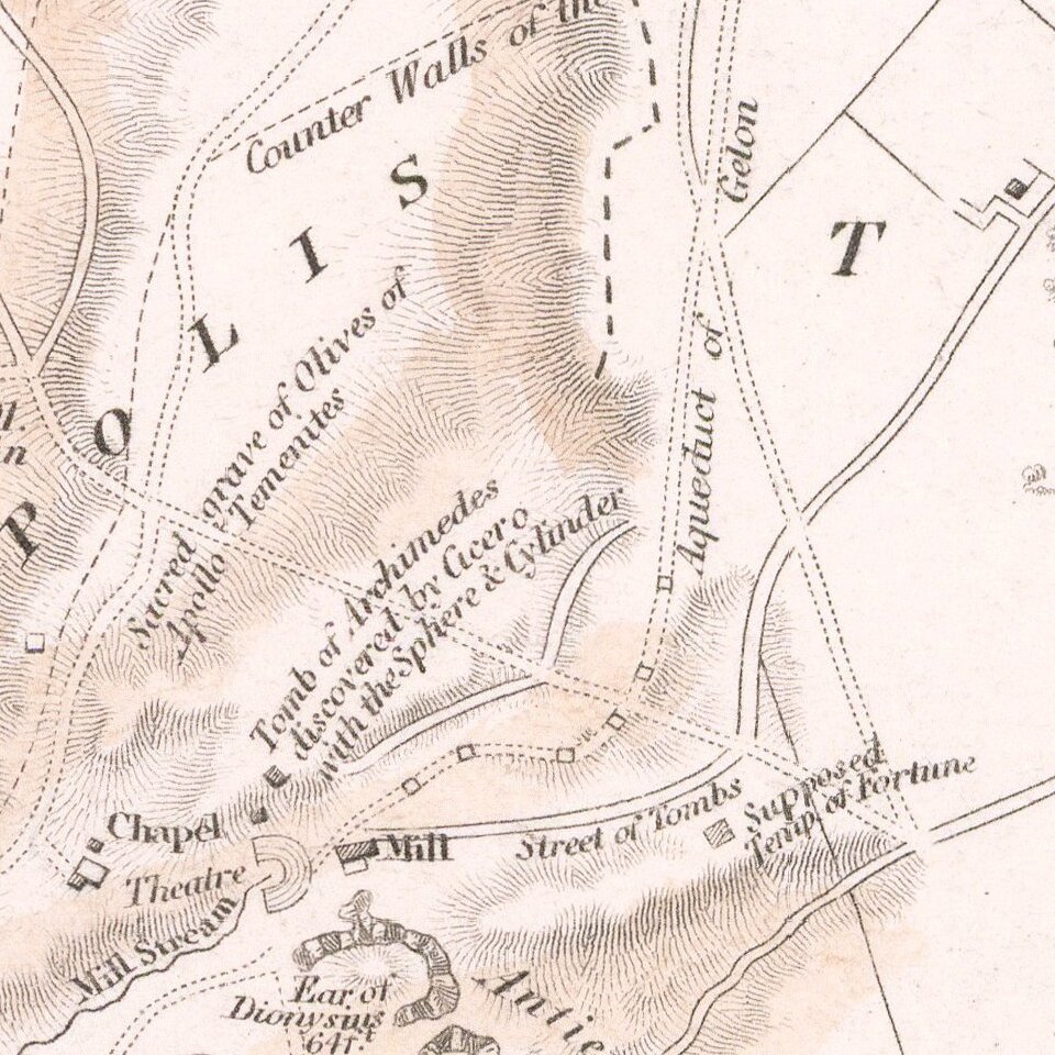 Highly detailed town plan of Syracuse, with a larger view of the City from its Roman Ampitheatre.