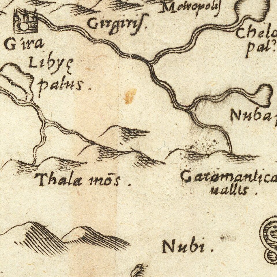 Final edition of Ruscelli's map of the Northern part of Africa, bounded by the Mediterranean, Aethiopia Interior, the Canarie Islands, Asia Minor, Judia, the Red Sea, the Persian Gulf, Arabia Felix and the Nile, to its source.