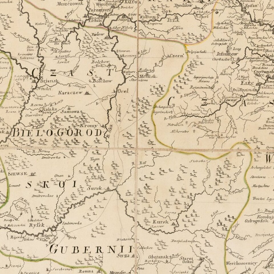 Fine separately issued example of JN De L'Isle's map extending from Moscow to the Ukraine, from the Atlas Russicus (Atlas Rossiiskoi).