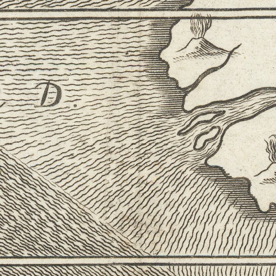 Meant to explain Kircher’s theories, not communicate geographic intricacies, there is little inland detail beyond continental names. This is one of the first maps to show oceanic currents, which are marked with hachures.