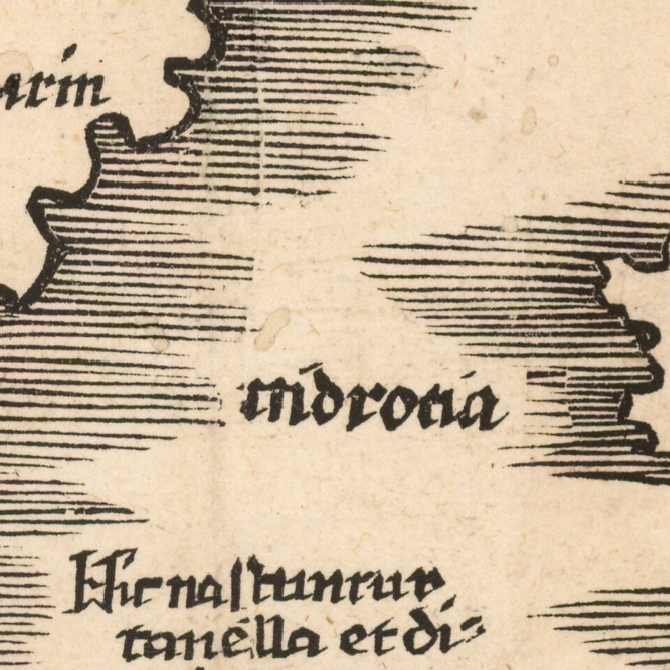 It is the Caveri map which Waldseemuller is believed to have seen and worked from. This is particularly seen by the fact that it extends further eastwards than the Cantino. Dominating the continent is 'India Intra Gangem' or India within the Ganges. The map displays a portion of the Arabian peninsula in the west including the entire Persian Gulf. The region represented by modern day Iran is named Carmania, an ancient Greek term for a province of the Achaemenid Empire. The prominent Indus River separates it from the recognizable Indian peninsula. Both the Maldives and Sri Lanka can be readily identified offshore. There has been considerable debate on the use of the term Taprobana and its use for Ceylon (Sri Lanka) and or Sumatra which we won't go into here. One of the major representations here is of an open Indian Ocean against the belief of Ptolemy who believed it to be closed. The Portuguese at this time had reached India and were setting their sights on apparently ever greater riches further east. In 1511 they captured Malacca clearly identified on the map near the tip of the peninsula. Suarez describes this portion of the map identifying 'Maitbane' as Martaban, a port at the mouth of the Salween River in Burma. 'Nagaragoy' is Lugor or Nakhon si Thammarat in southern Thailand. Caveri described the region here as bearing 'rubies and other stones of great value'. He states that the peninsula 'is in fact a first attempt to map 'true' Malaya and Indochina, and was probably extrapolated in large part from Arabic textual sources. Some of the nomenclature on the map agrees with Islamic navigational texts'. He goes on to cite the example of 'Timonia' (Pulau Tioman) off the south eastern shore which was not known to the Portuguese at the time but was a regular port of call for Arab and Malay traders since at least c.850.