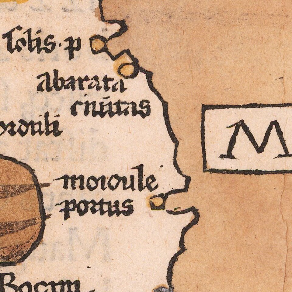 The map is drawn from the work of Nicolas Germanicus, whose manuscript maps were created to illustrate pre-1470 editions of Ptolemy's Geographia.