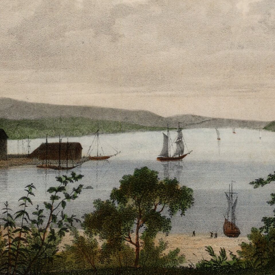 Decorative print of Tarry Town lithographed by Bichbois, which appeared in Jacques Milbert's rare Itineraire Pittoresque du Fleuve Hudson &c
