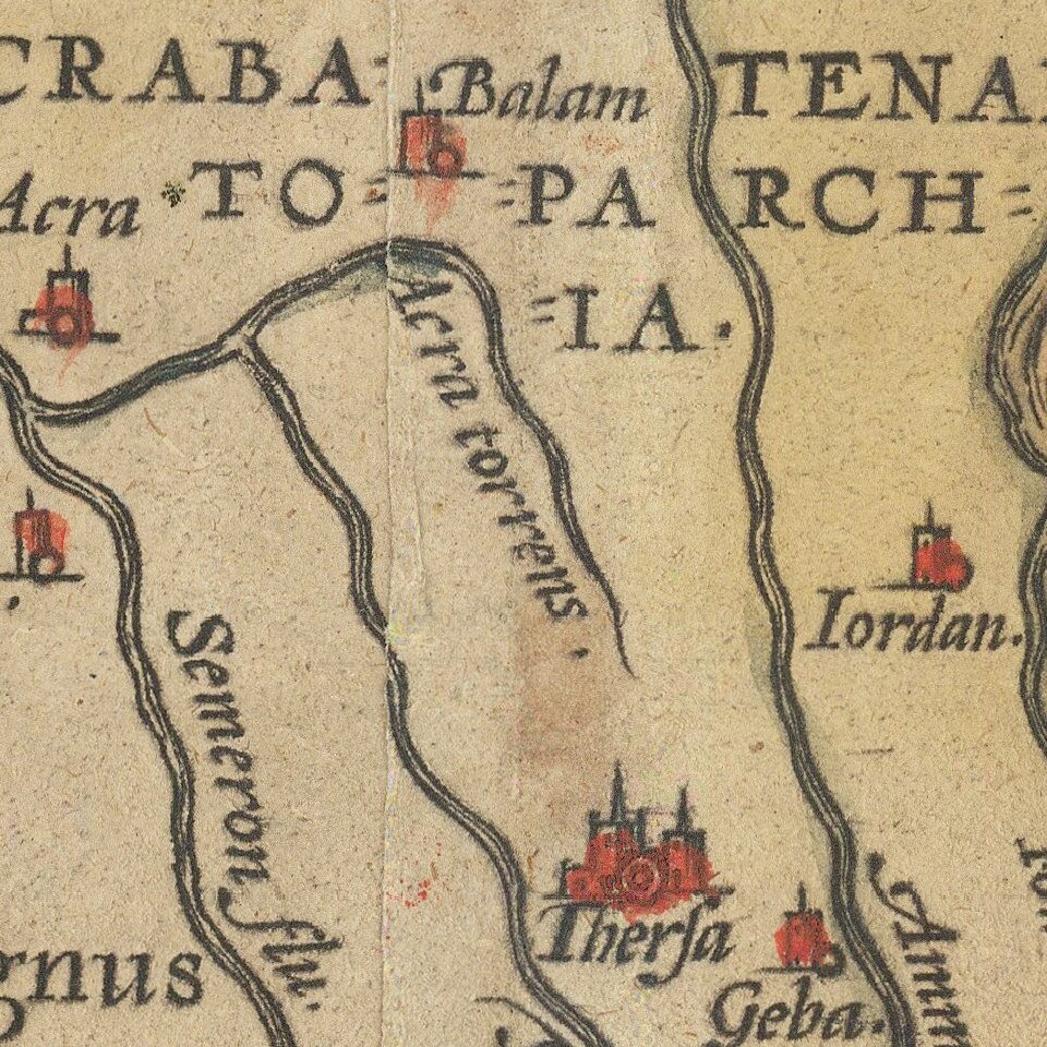 The map is based on a 9 sheet map of Palestine by Christian Sgrothen (Christian Schrot), published around 1570, which in turn was based on cartographical sources collected by the Dutch astronomer, Petrus Laiksteen, during his visit to the Holy Land in 1566.