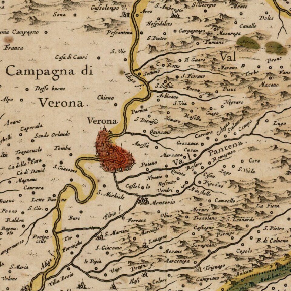 Nice old color example of Jansson''s map of the Territory of Verona, centered on Verona and Lago di Garda.
