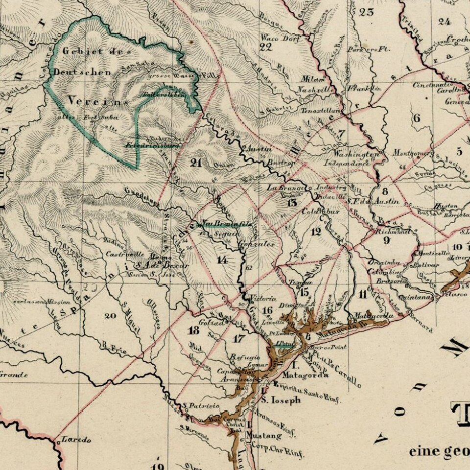 While the map is unrecorded and its source is unknown, we are of the opinion that the map was printed, but ultimately never included in a printed book or pamphlet. Originally intended for use by German emigrants to the Adelsverein lands in Texas, the map locates several Texas colonies in outline color. The map also includes distances from Galveston and Indian Point to various locales. The road from Port Lavaca through Victoria, Seguin, New Braunfels, Fredericksburg, and on to Fort San Saba is shown, as is the old King's Highway between Presidio Rio Grande and Nacogdoches, with intermediate distances. In North Texas, Coffee's Trading House is located on the Red River.