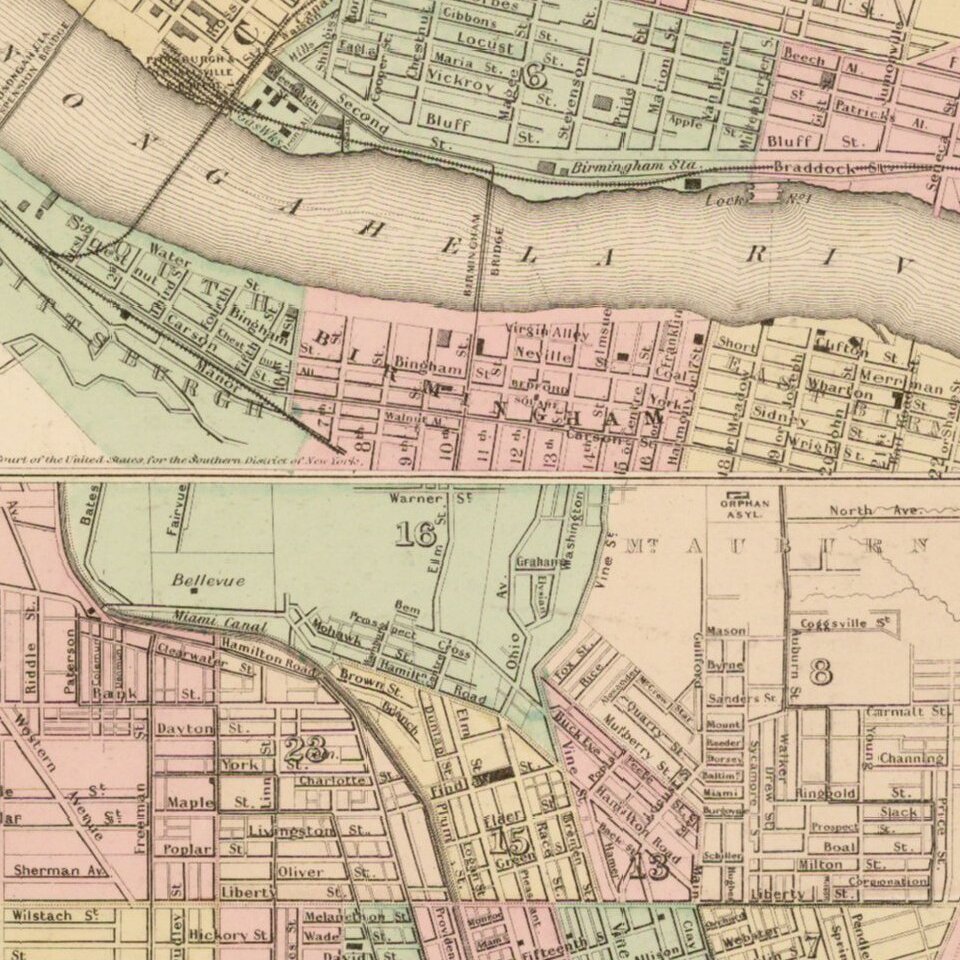 Early Pittsburgh maps are scarce. Decorative border. A terrific map, from JH Colton, one of the most prolific American mapmakers of the mid-19th century.