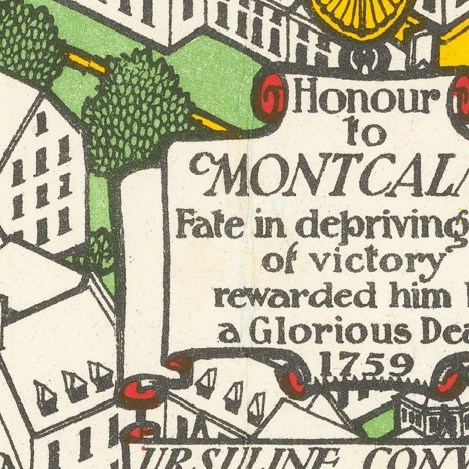 Decorative historical map of Quebec, richly adorned by coats of arms and historical facts.