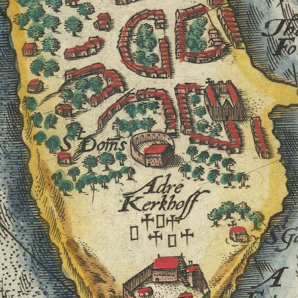 Among other things, Vehlo gives an account of certain corrupt captains who were then actively stealing from the King, setting up their own side businesses, using the King's stores, and murdering local traders to escape their debts. The map depicts Vehlo's tower, along with the church and other structures, and provides a nice thematic depiction of the island and port, which were then being visited by more than 500 ships per year.