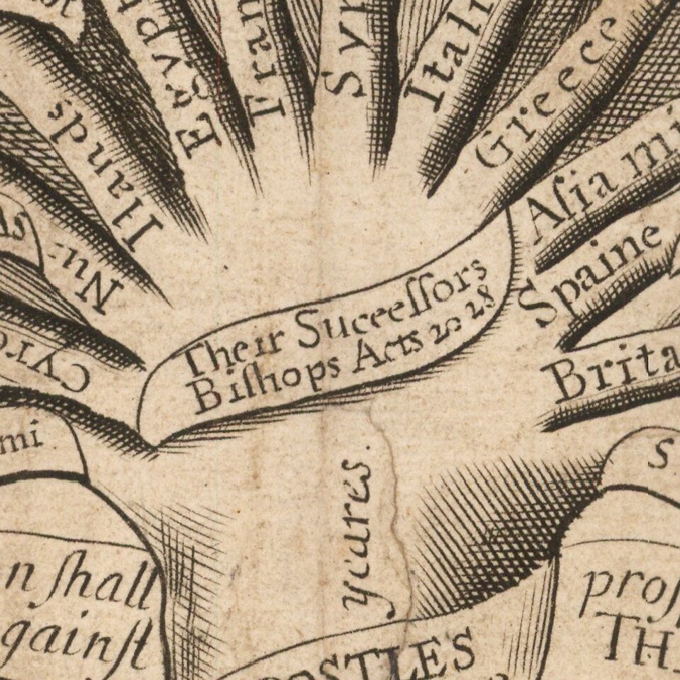 A cedar tree representing the traditional episcopal church, inscribed on the trunk 'The Church Catholick', with two smaller shoots from the trunk labelled 'Presbytery' and 'Independency'; two men on ladders cutting away branches; to the side, two smaller trees being tended by various figures, with the inscriptions 'New, but not True, Plants' and 'These hold neither Root nor Order.