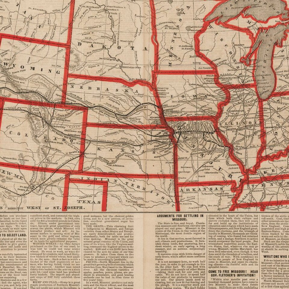 ...U.S. from east to west coast north of Texas. Boundaries colored in red. Text beneath map and on verso. Text extolls land and region. There is also interesting social commentary on the society of Missouri in the aftermath of the Civil War. Apparently rare... The Central Pacific is shown developed just beyond Pyramid Lake and the Union Pacific is still in Nebraska. Many railroads, existing and projected are shown. Areas in California, Idaho, Wyoming and Colorado are labeled Gold Region. The Oregon Trail is shown, though not named as such, and is named in one stretch, New Worked Emigrant Rd - curious. Construction of the Hannibal and St. Joseph RR began in 1851 from both cities and was completed in Feb, 1859. On the map it appears that all the towns on the line are located and named. In 1860 the RR met the Pony Express. The railroad was acquired by the Chicago, Burlington and Quincy RR in 1883."The verso includes 2 full pages of promotional text.