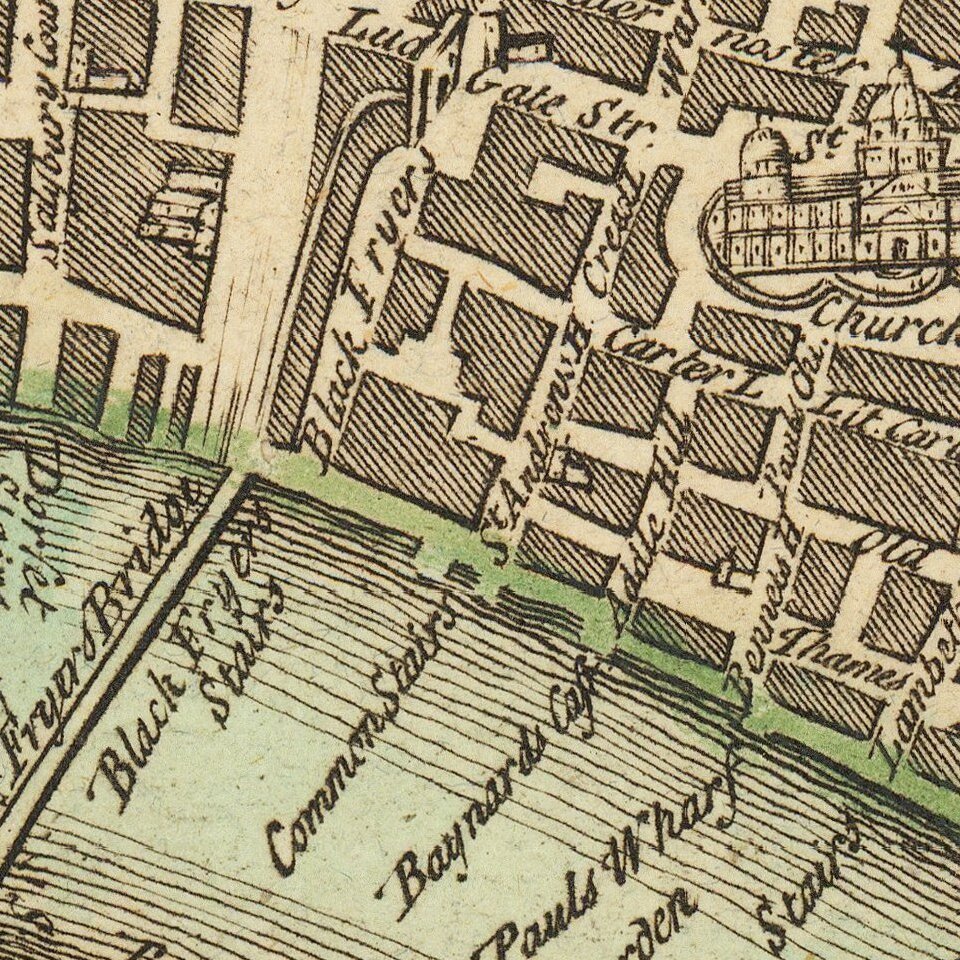 As the map was intended for visitors to London it includes notes on Hackney Coach rates ("There are 700 Hackney Coaches allow'd to Ply within ye Bills of Mortality, having Numbers fix'd to them & regulated by Commissioners for that Purpose, 170 of these Coaches are permitted to Ply on Sundays, their Rates are as follows."), and rates for crossing the Thames ("The fixing of the Rates or Fares of Waterman by Antient Act of Parliament, is in ye Power of the Lord Mayor and Court of Aldermen by whom they were last set forth September 7, 1671. and are as follows..."
