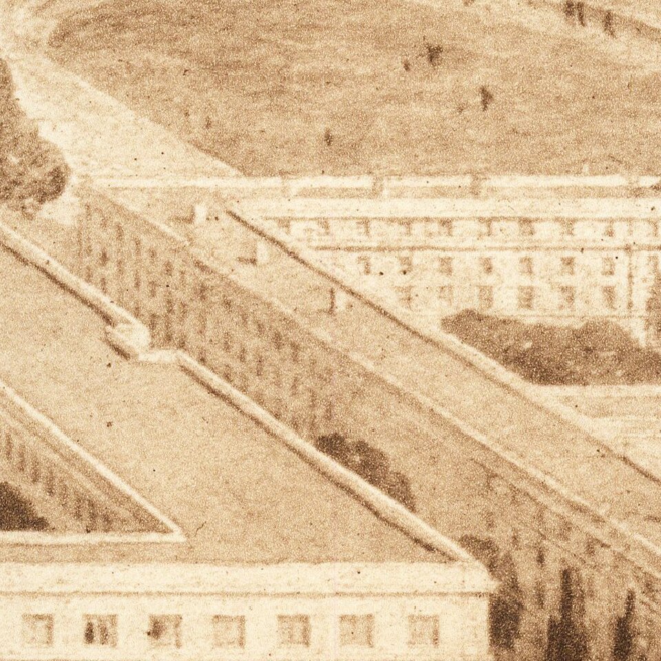 Bosworth's view shows MIT from across the River, illustrating the original buildings 1to 10 (excepting 9) and the Great Dome holding a prominent place. The engineering lab is illustrated on the right, with the original athletic field behind it. A number of the buildings shown were never built.