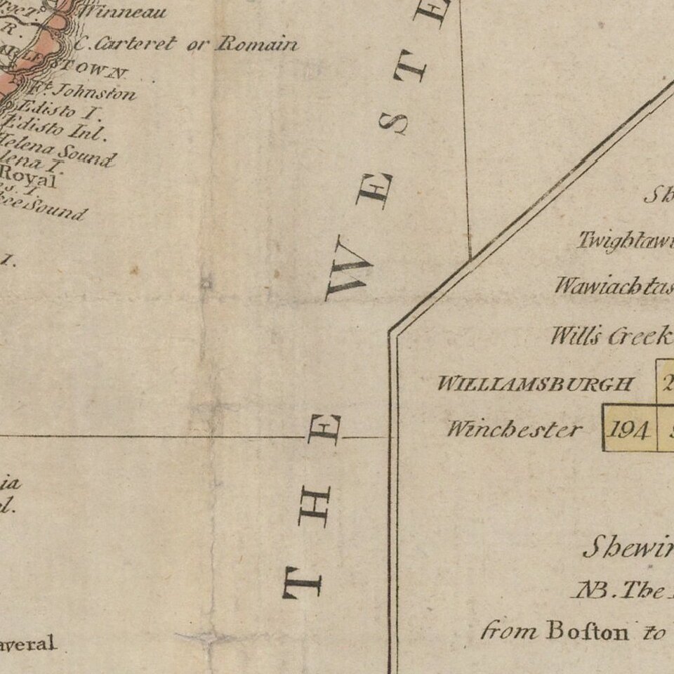 The purpose of the map and broadside was to give the British public an overview of the colonies in which the conflict was developing. The map occupies the upper portion, with the colonies described in the letterpress below. Inset on the map is a table of the distances which must have been enlightening to the English who imagined the colonies to be much smaller and close together. In addition, a population chart lists Virginia and Maryland's population of "Men (White and Black) able to bear Arms" at 180,000. On Virginia the publishers note that the colony "seems unrivaled throughout the universe for convenience of inland navigation; indeed, it has been observed, and with reason, that every planter here has a river at his door."