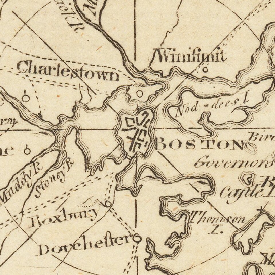 At the top right corner, there is a detailed depiction of the "Action near Charleston 17 June 1775". A note shows the "Provisionals Retreating to Cambridge," as well as battery positions and the troops landing at the far side of the town. Better known as the Battle of Bunker Hill, this marked a major strategic turning point in the Revolutionary War. The British Army attack on the redoubts on Breed Hill, as portrayed on the map, lead a Pyrrhic victory, where they were able to force the "provincials" to retreat albeit with many casualties. This made the British take a more cautious approach to the war, allowing for colonists time to strengthen their numbers, tactical advantages, and politics.