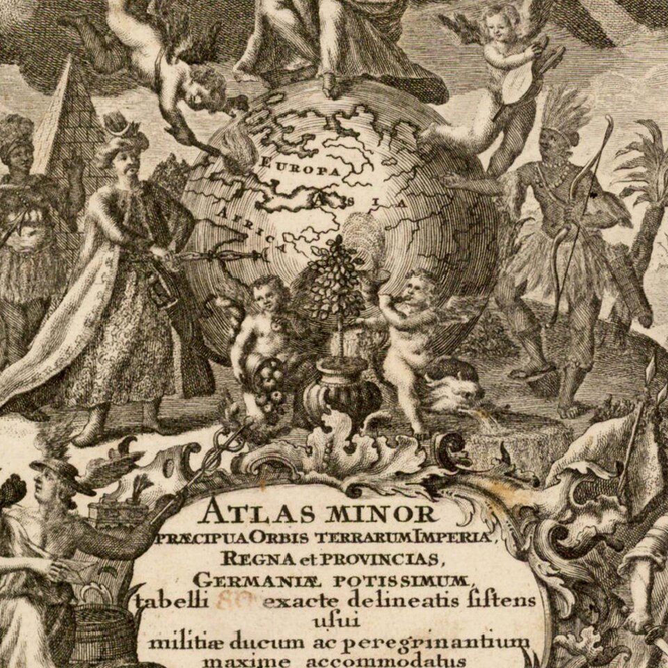 Decorative title page, with an elaborate scene showing a queen atop the globe and allegorical figures below.