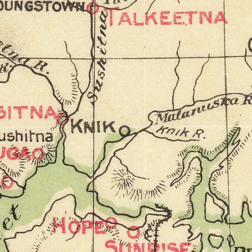 The map identifies dozens of the most important towns in Alaska in Red.