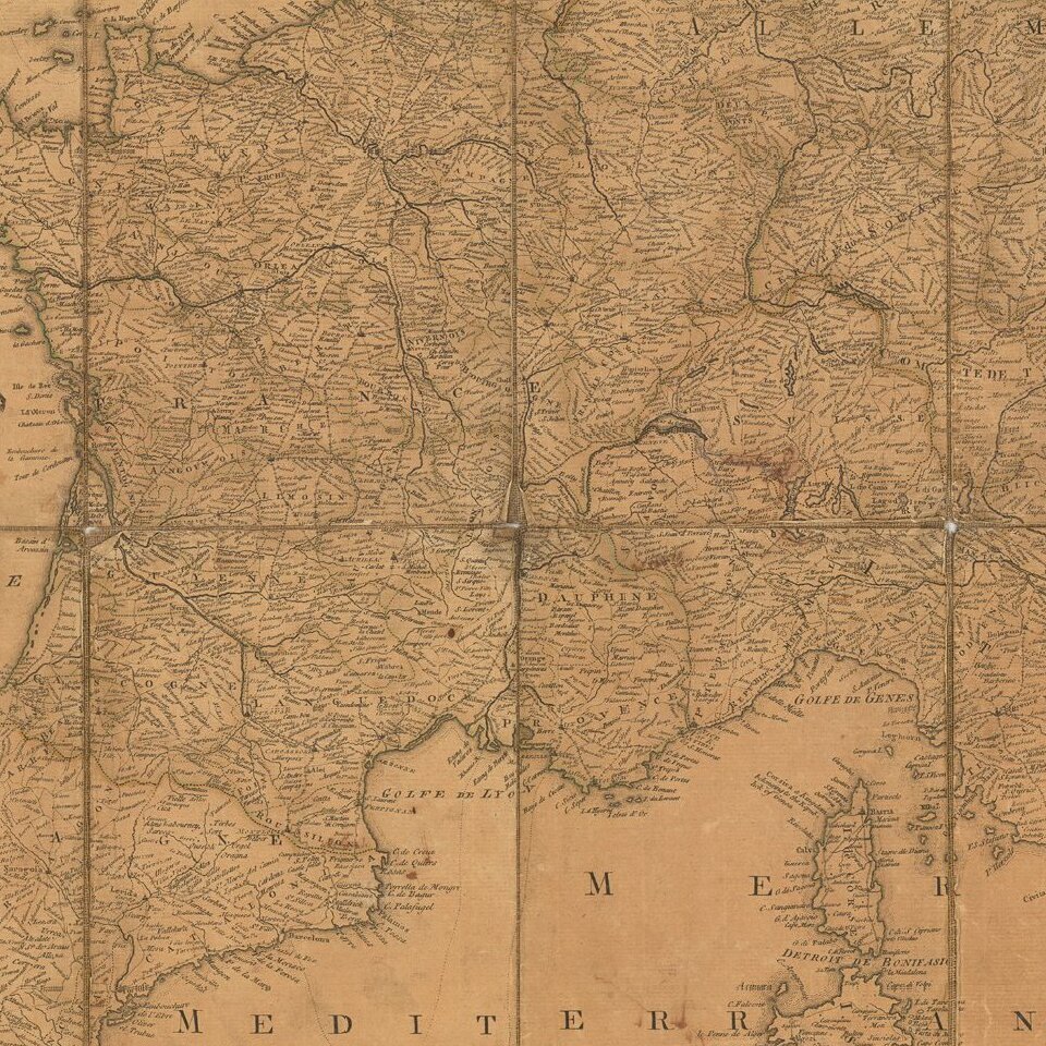 Somewhat warn example of John Rocque's map of the Post Roads of Europe, published by Robert Sayer in London, in 1773.