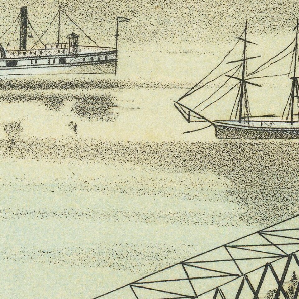 This panoramic map shows Toledo, Ohio, as it appeared in 1876. . . . The map shows a busy harbor and major points of interest, including freight elevators, the city’s many churches, and the depot of the Lake Shore & Michigan Southern Railway, the main rail line between Chicago and Buffalo.