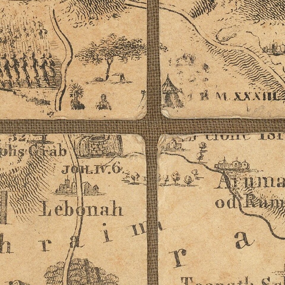 Finely executed map of the Holy Land, including 96 pictorial vignettes illustrating events from Biblical History.