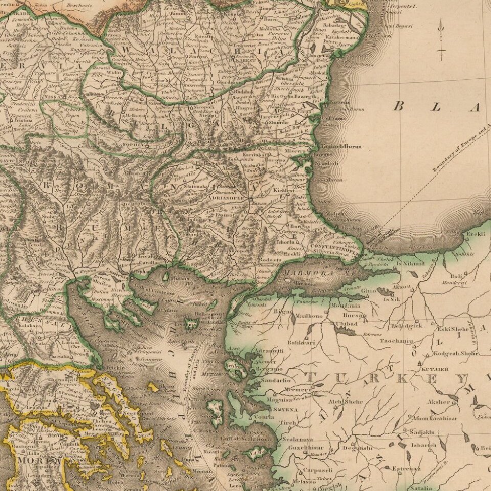 Striking and highly detailed map of Turkey, Greece, the Balkans, Cyprus and the Black Sea.