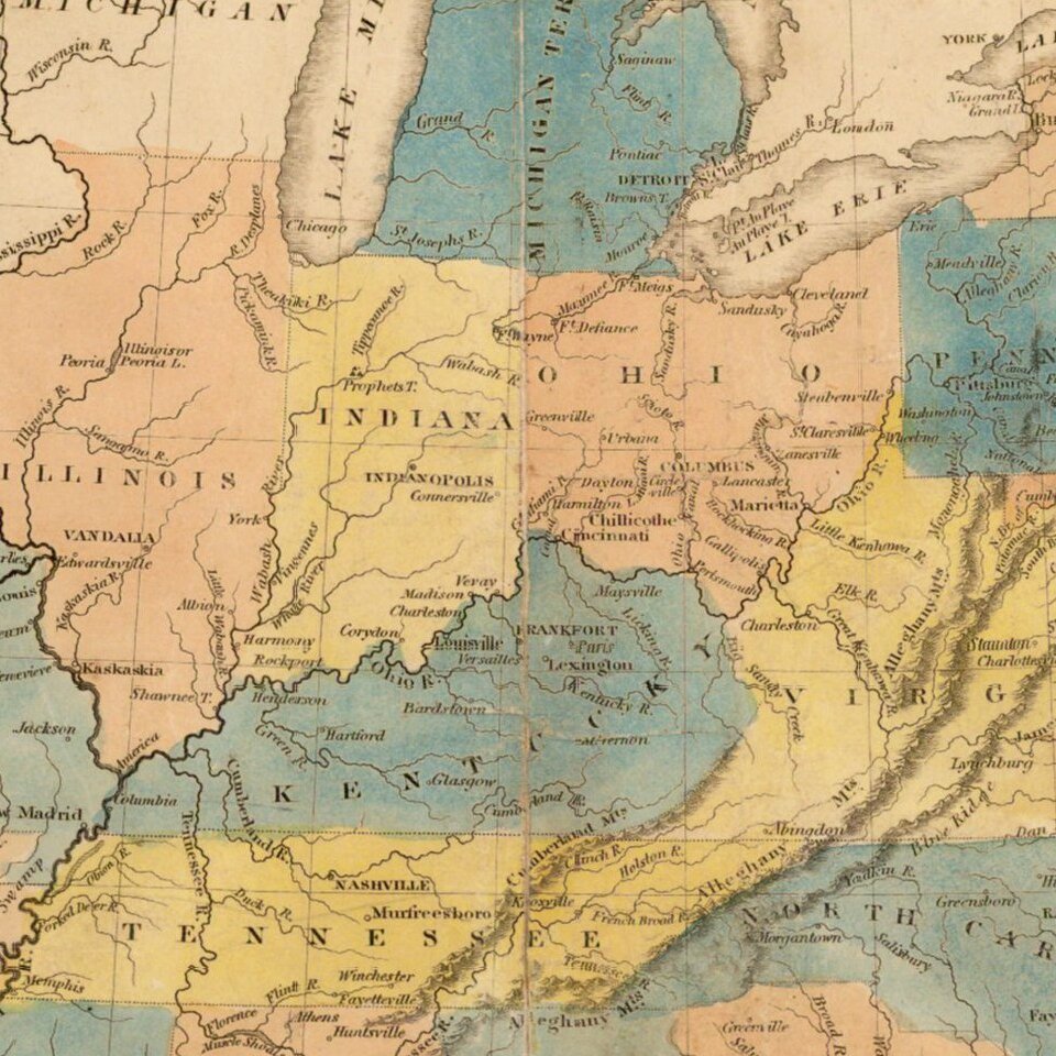 The map shows a large region west of Lake Michigan entitled North West Territory Attached to Michigan. The massive area now known as Missorui Territory is identified, then the domain of french fur traders and adventurers. Texas is named, immediately before the arrival of Stephen F. Austin.
