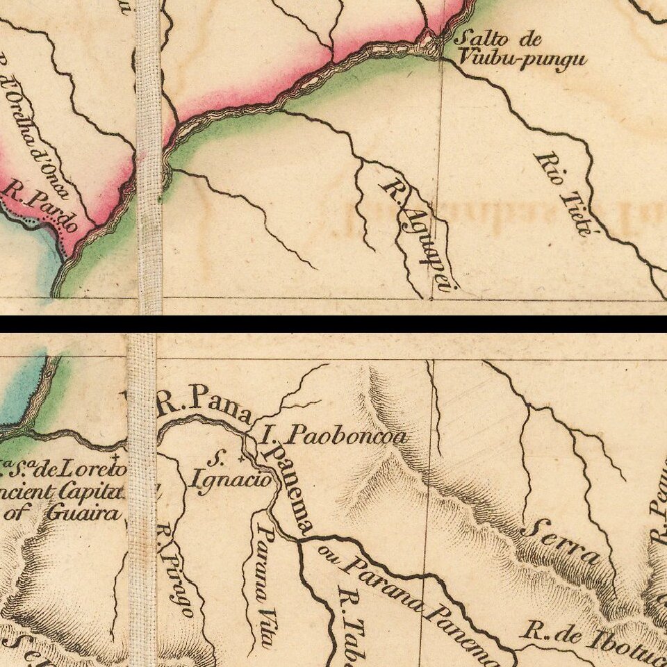 Coming only 8 years after Faden's publication of the Cruz Cano y Olmedilla map of South America, it is remarkable to see the dramatic improvements. The Cruz Cano had originally been published by the Spanish Government in 1775, but had been suppressed shortly after it publication. Cruz Cano's map was based on cartographic material of Consejo de Indias, Jose de Ayala and the reports of the Jesuits and other missionaries in South America. Cruz Cano had spent ten years collecting measurements made by explorers and colonists and incorporated in the map valuable geographical and historical news, with some references to the sources used. Measuring approximately 6 x 8 feet, the Cruz Cano map is probably the most important map of South America made in the 18th century.