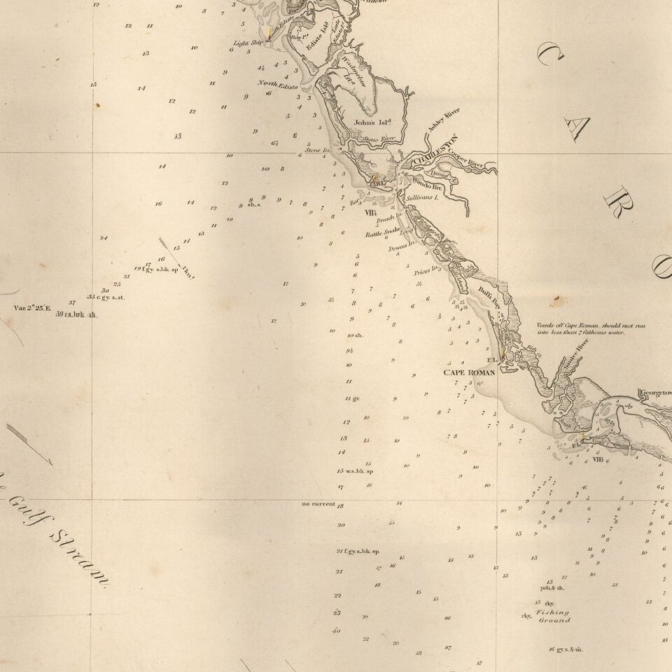 Blunt's sea chart of the Southeastern US is one of the earliest obtainable sea charts of the region published in America. While chart makers such as Matthew Clark and John Norman produced charts of this section of the coastline for commercial use early as the the last decade of the 18th Century, it was not until Blunt's charts that American commercial publishers began competing with their English competitors for primacy in the American market, preferring instead to be as distributor of charts, as was Blunt during the first 20+ years of his business career.