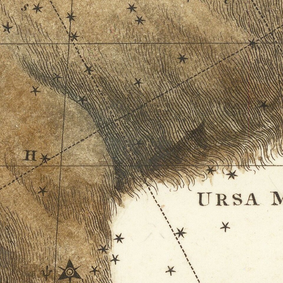 Includes a colored Ursa Major and uncolored parts of the constellations of Ursa Minor, Camelopardalis, the Lynx, Cancer, Leo Minor, Chara, Cor Caroli, Asterion, and Draco.