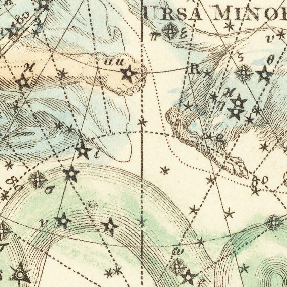 Striking star chart of Ursa Minor, Cassiopeia, Cephus and Draco, marvelously engraved and delicately colored. Shows the featured constellations in color with neighboring stars and constellations without color.