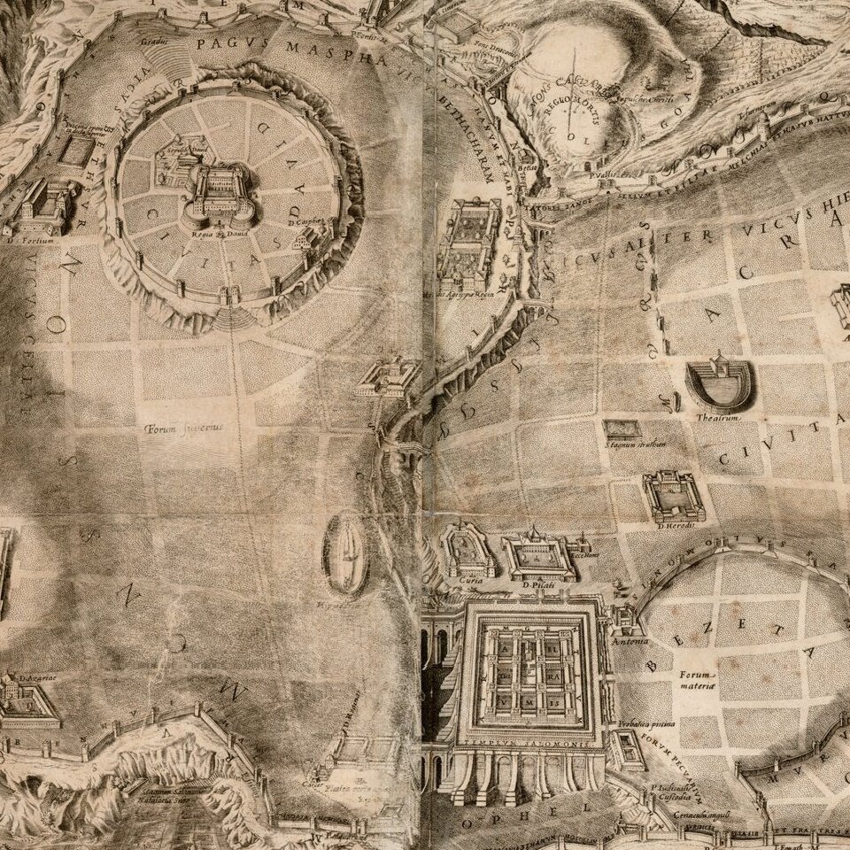 Villalpando was a Spanish Jesuit scholar & architect, who drew reconstructions of the classical city based on the assumption that the buildings of Jerusalem were designed using the laws of geometry and based on the ideals of the Roman writer Vitruvius. His plan of Jerusalem would become the most influential and copied plan of the ancient city over the next 100+ years.