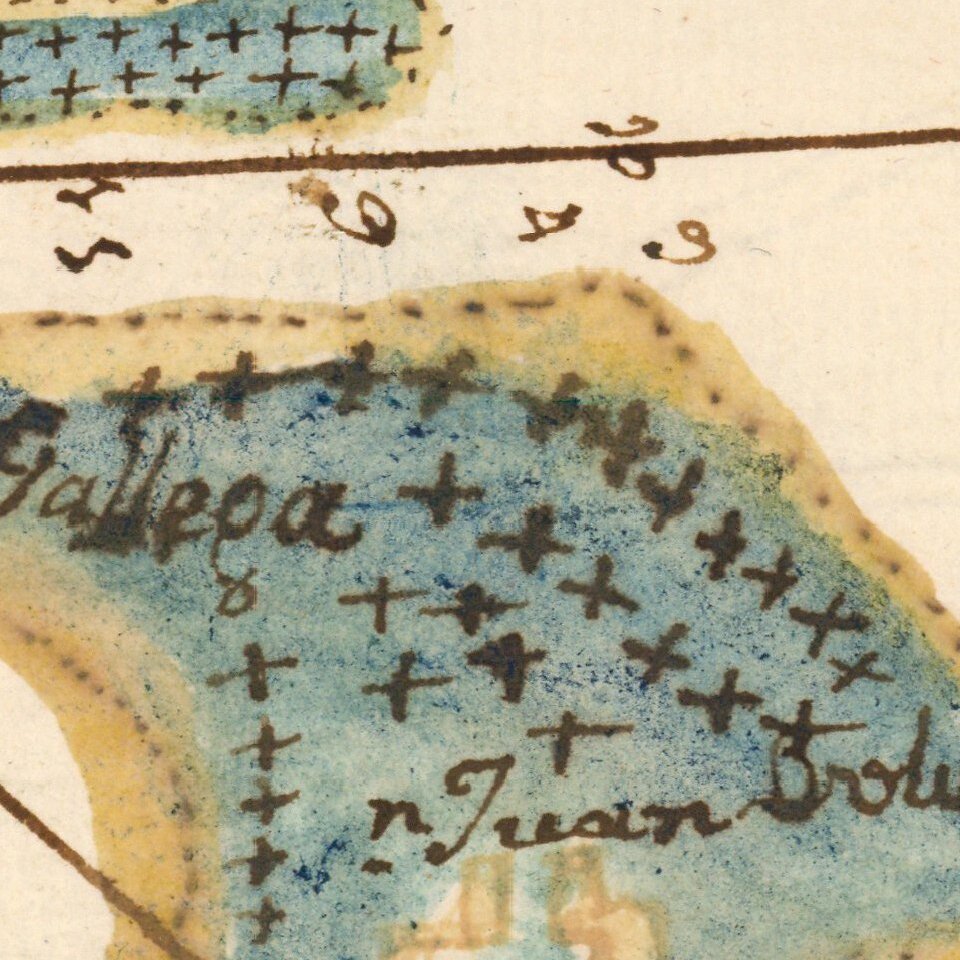 The paleographic evidence points to a likely creation date of ca. 1700. The chart is northeast oriented and shows many details meant to help pilots and sailors. The shore is shown with a thick blue line extending into the waters, warning of the shallows that border the coast. Obstructions to navigation are highlighted with numerous “x” marks. Large sandbanks and sediment build-ups, some around the islands near the port, are drawn in blue and outlined in a lighter color. Sounding depths also indicate that this was a document meant to aid navigators negotiating the port’s tricky hydrography.