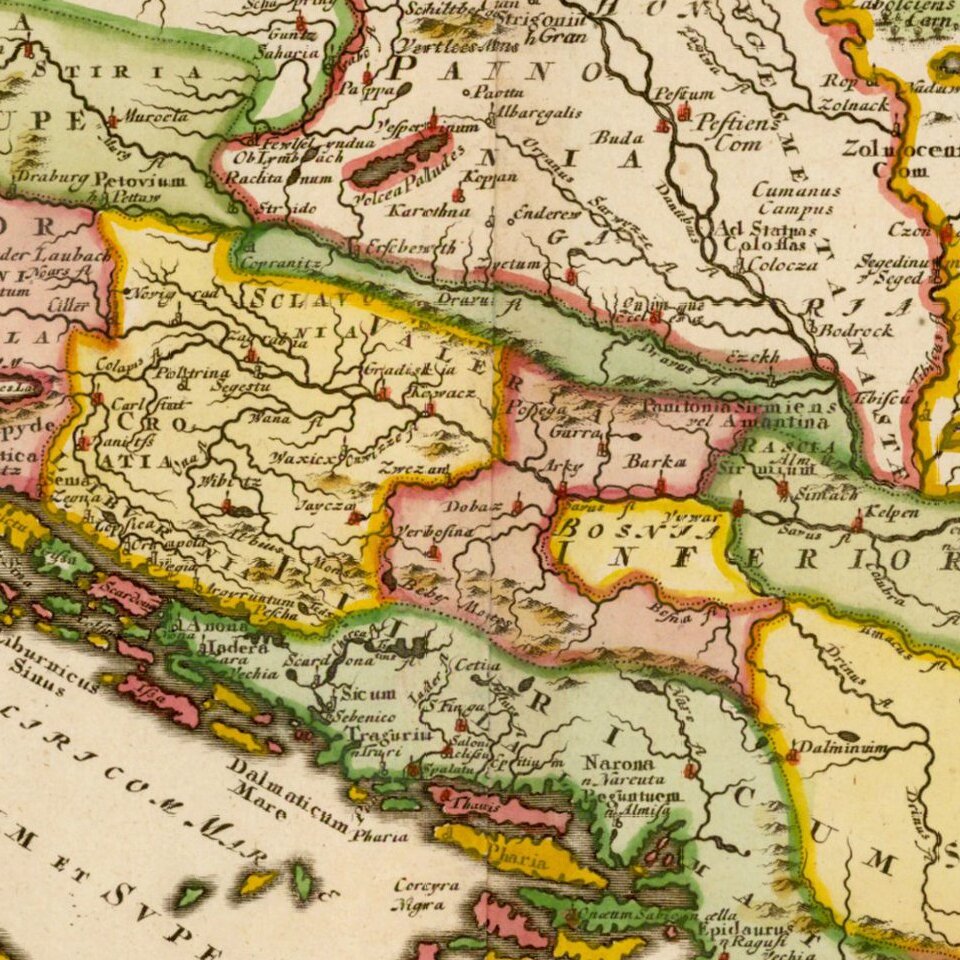 Decorative map of the region north of the Adriatic Sea, with a decorative cartouche.