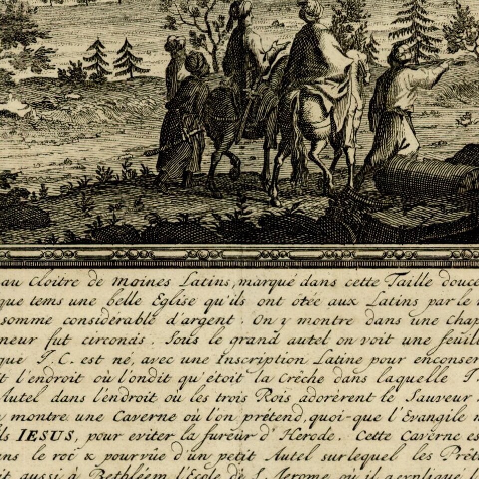 Decorative birdseye view of Bethlehem and Nazareth, from Chatelain's monumental 7 volume Atlas Historique.