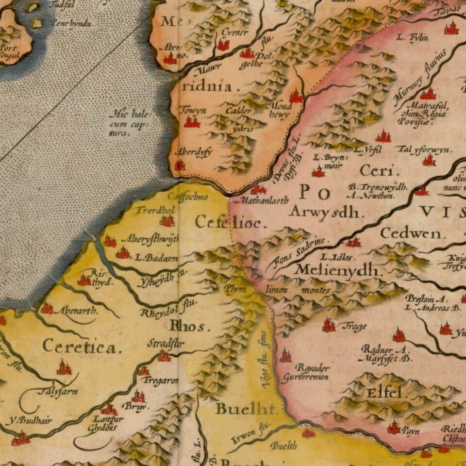 The map is derived from the Welsh cartographer Humphrey Lhuyd's 1568 map, the first modern map of Wales. The map was revised and made slightly smaller in Mercator/Hondius atlases engraved by Pieter van den Keere c. 1636-42. This example is the re-engraved second state from the Mercator/Hondius/Jansson atlas Hondius Nouvel Atlas. It was re-issued in a third state for Jansson's Atlas Major and later editions. Earlier examples were also included in editions of the Ortelius Theatrum Orbis Terrarum 1606-33.