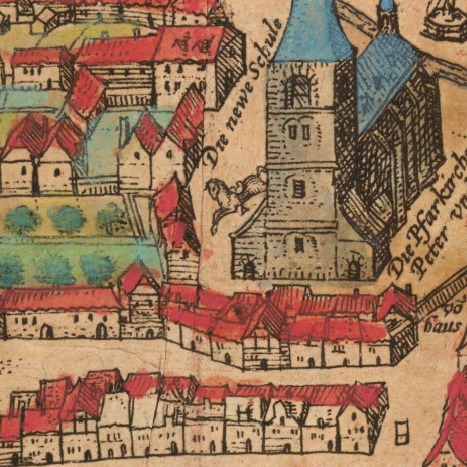 Georg Braun (1541-1622) was born and died in Cologne. His primary vocation was as Catholic cleric; he spent thirty-seven years as canon and dean at the church St. Maria ad Gradus, in Cologne. Braun was the chief editor of the Civitates orbis terrarum, the greatest book of town views ever published. His job entailed hiring artists, acquiring source material for the maps and views, and writing the text. In this role, he was assisted by Abraham Ortelius. Braun lived into his 80s, and he was the only member of the original team to witness the publication of the sixth volume in 1617.