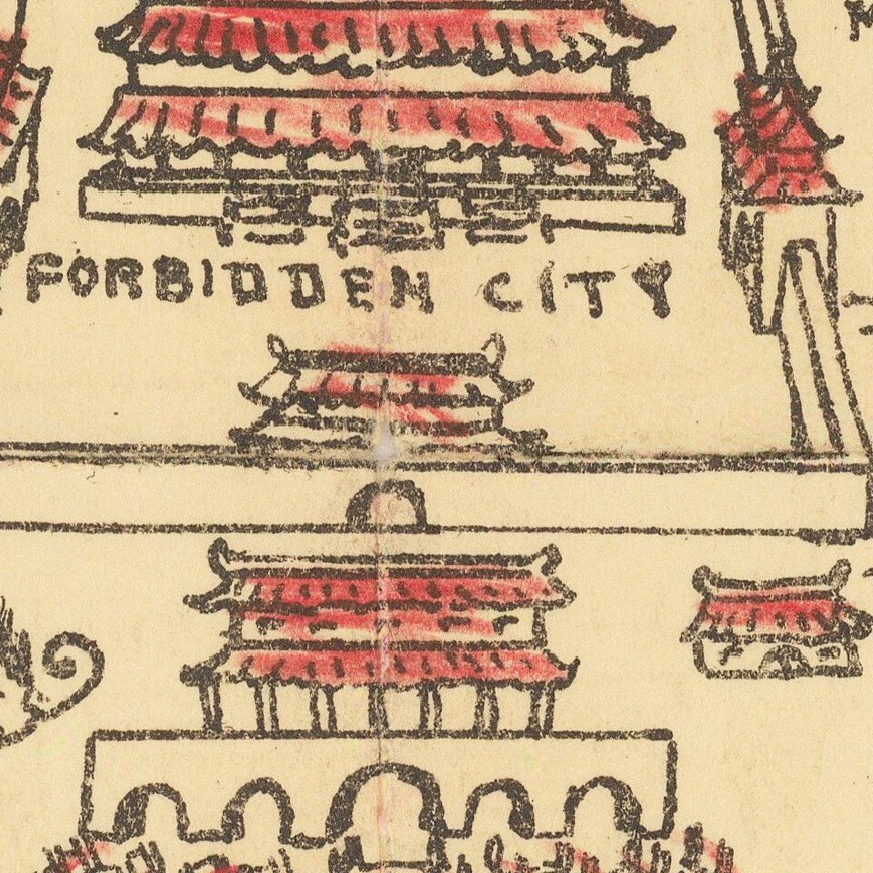 The map takes the viewer on a cartoonish tour of Beijing, or Peiping as it was sometimes called. Crenelated walls surround the city, with three-tiered gates allowing entrances and exits. A select number of streets are drawn in for orientation, as are major sites of interest including the Forbidden City, the Winter Palace, the Tower of Agriculture, the Temple of Heaven, and various other sites such as the Polo Field and Gold Fish Pools. Tucked into the walls of the city on the right side is the Observatory, complete with a globe and an armillary sphere.