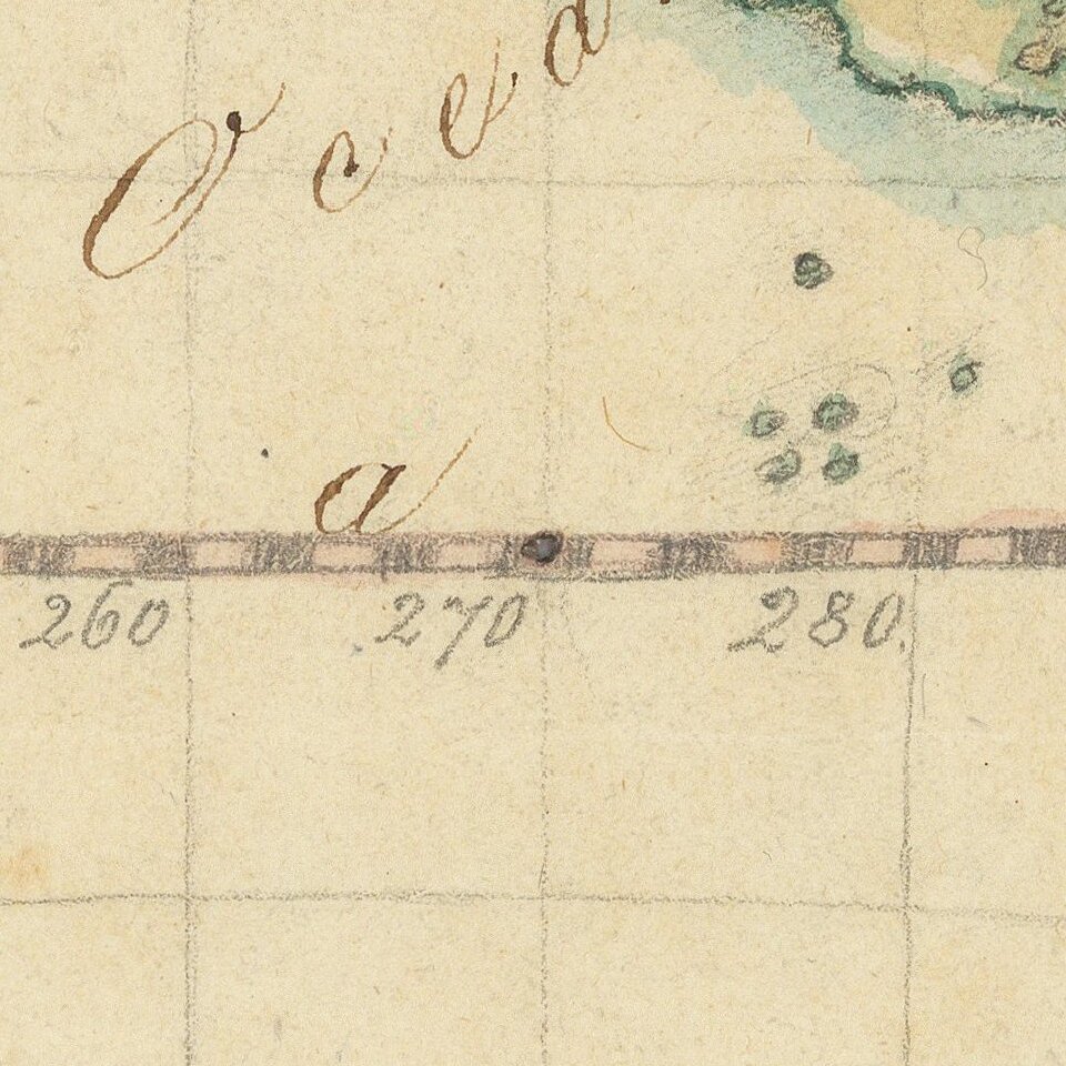 In the Pacific, New Zealand’s coastline is unfinished, suggesting that this map was made before the voyages of James Cook were widely known. Combined with the depiction of Alaska, which suggests that the base map had integrated some of the information from the Bering expeditions of 1725-30 and 1733-43, a likely date of creation is ca. 1760-1770. The paleography is consistent with this date range.