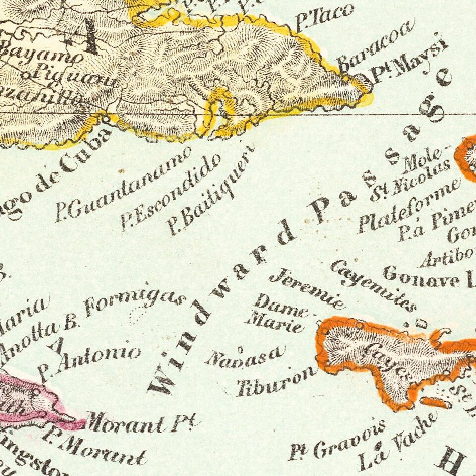 Detailed map of the Caribbean, from Florida to the cCoast of Venezuela and the Yucatan.